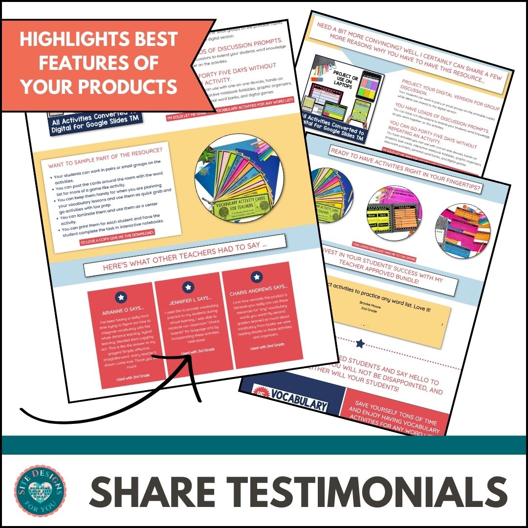 The template is set up to help your potential customers recognize the problems your resource will solve for them. You’ll share with them your resources best features, action photos, product details, positive testimonials from previous buyers, standards taught with the resource, and any file details (print, digital, center games, projects).