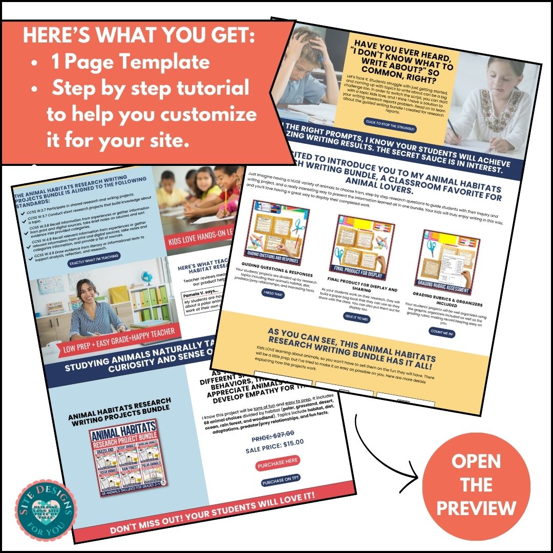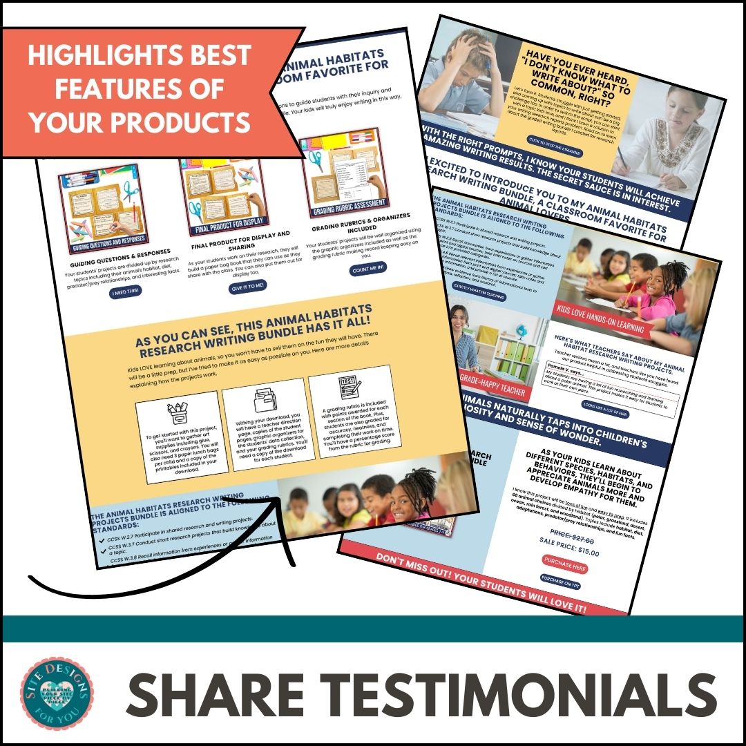 The template is set up to help your potential customers recognize the problems your resource will solve for them. You’ll share with them your resources best features, action photos, product details, positive testimonials from previous buyers, standards taught with the resource, and any file details (print, digital, center games, projects).